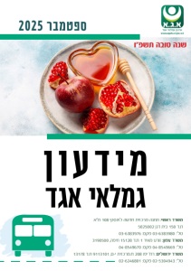 ת"א 108 תחנה מרכזית חדשה לוינסקי משרד ראשי: 5025002 בית דגן 150 ת.ד 03-6383976 פקס: 03-6383980 טל': 3190500 חיפה, 15128 ת.ד 1 זורע מאיר משרד צפון: 04-8549670 פקס: 04-8549669 טל': 13178 ת.ד 9113101 ת.מרכזית י-ם, 208 רח' יפו משרד ירושלים: 02-6246801 פקס: 02-5304943 טל': ארגון גמלאי אגד www.aga4u.style.co.il מידעון אגד גמלאי 2025 ספטמבר שנה טובה תשפ"ו
